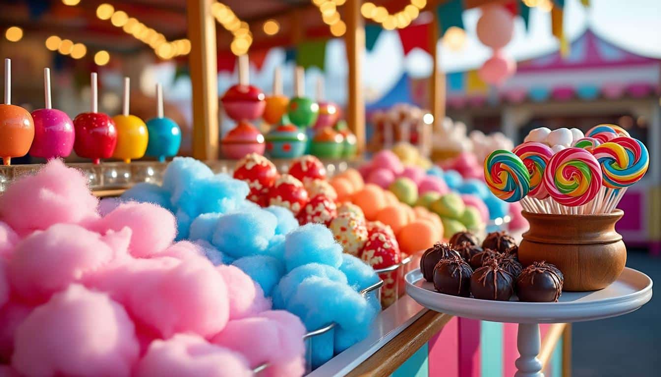 Les stands de fête foraine proposent une variété de bonbons qui font le bonheur des visiteurs. Ces friandises évoquent l’enfance et l’insouciance.